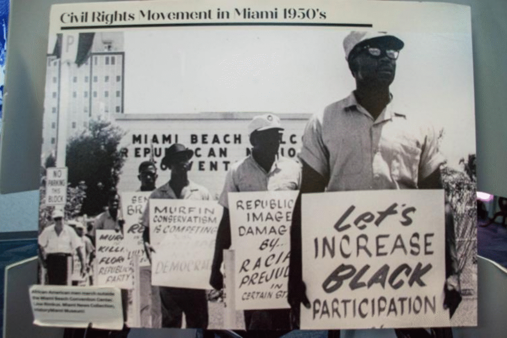 A picture showcased inside the Virginia Key Beach Park building, depicting the Civil Rights Movement. (Amelia Orjuela Da Silva for The Miami Times)