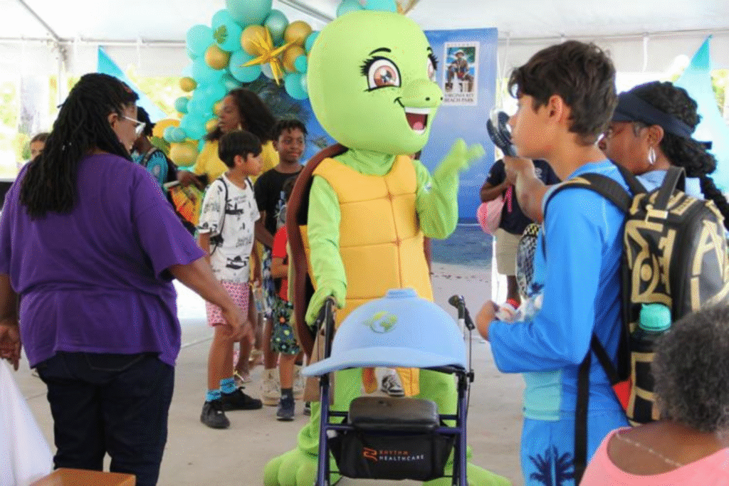 Park mascot Shelly the Turtle pushes a walker around the birthday party, making attendees laugh and smile.(Morgan C. Mullings for The Miami Times)